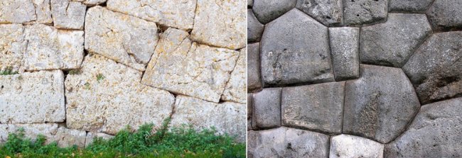 Стена в Алатри (Италия) (слева) и стена в Саксайуаман (Перу) (справа). Сходство заметно даже в деталях. Громадные камни уложены в стену по принципу многоугольника без использования соединительного раствора