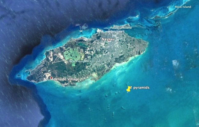 Пирамиды находятся в 6,6 км к югу от багамского острова Нью-Провиденс. Координаты места на Google Earth 24°56’26.50?N