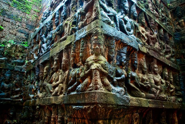 Но чаще других встречается здесь фигуры апсар — богинь-танцовщиц. Их здесь тысячи, и ни одна не похожа на другую. Сложнейшие барельефы воссоздавали важнейшие эпизоды битвы при Курукшетре, описанной в «Махабхарате», сцены из «Рамаяны» и зарисовки из жизни правителя Сурьявармана II.