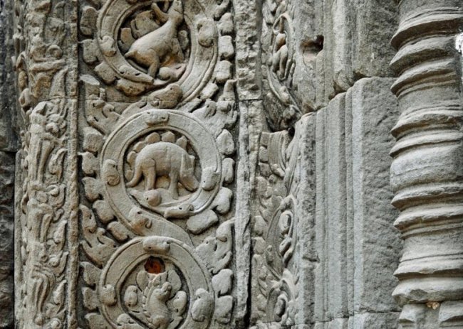 Стены храма покрыты искусной резьбой, которая тоже хранит удивительные тайны. Среди прочих там можно увидеть вполне реалистичные изображения мифических грифонов, василисков, а также… стегозавра и гиракодонта (вымершего 20 млн лет назад предка носорога).