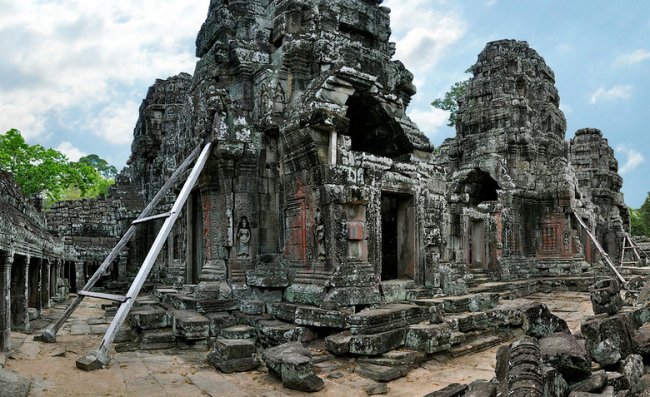 Удивительно, как в X в. кхмеры смогли воздвигнуть такое исполинское сооружение. Сложнейшая трехуровневая конструкция, подобно муравейнику, вся пронизана потайными ходами, лестницами и кельями-камерами. Вдоль каждого уровня проходят галереи, украшенные гигантскими барельефами и статуями. К счастью, камня здесь много, и он лежит слоями в округлых холмах высотой 70—80 м. Песчаник был красив и мягок, легко уступал теслу и резцу.
