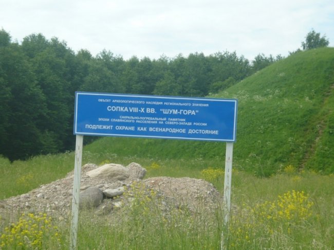 Да и сама Шум-гора, скорее, представляет собой конструкцию из мощных каменных плит, сверху засыпанную грунтом. Вся эта территория называется Передольским погостом, который занимает земли от деревни Подгорье до деревни Заполье, вдоль реки Луга. Площадь погоста примерно 10 гектаров, и здесь можно насчитать семь крупных курганов.