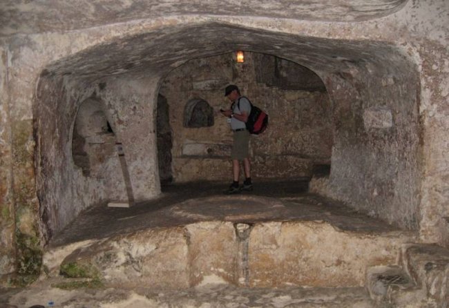 Это, пожалуй, самый интересный объект. Он находится на втором уровне гипогея. В этой комнате вровень с лицом человека среднего роста есть небольшая овальная ниша. Если что-то в нее сказать низким голосом, звук, многократно усиленный, разнесется по всем подземным помещениям. Но если вы произнесете что-либо голосом высоким, вас не услышат даже те, кто стоит неподалеку.