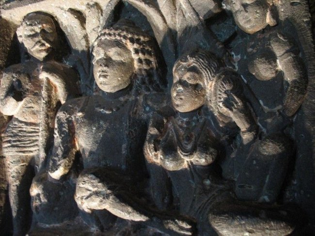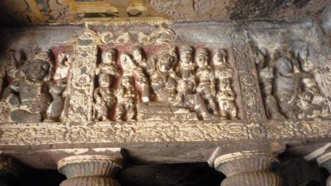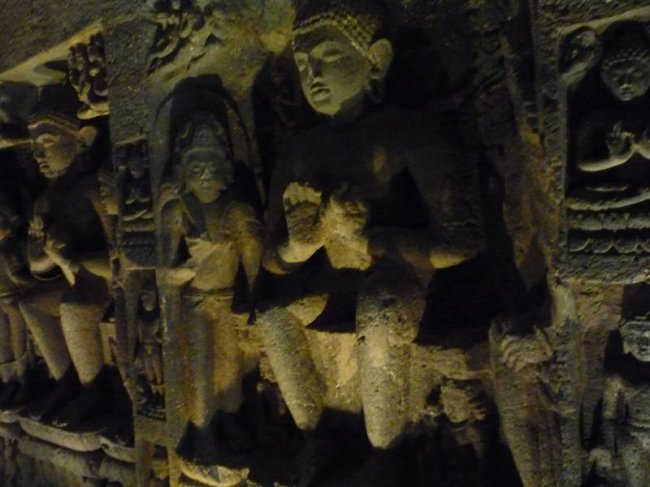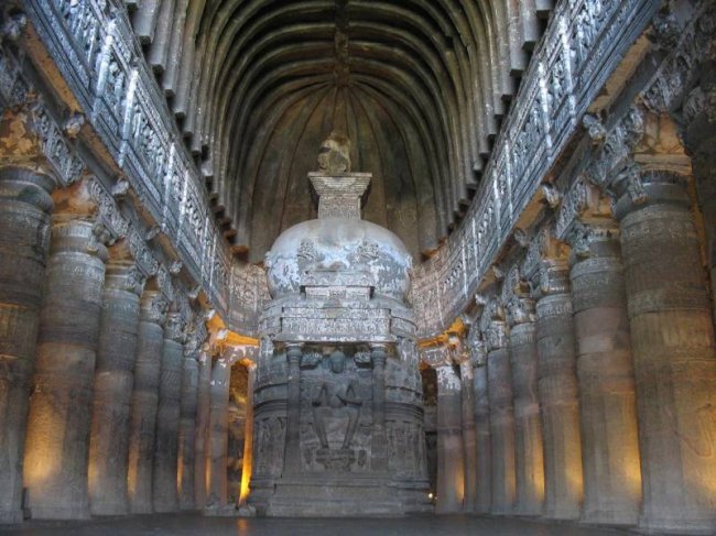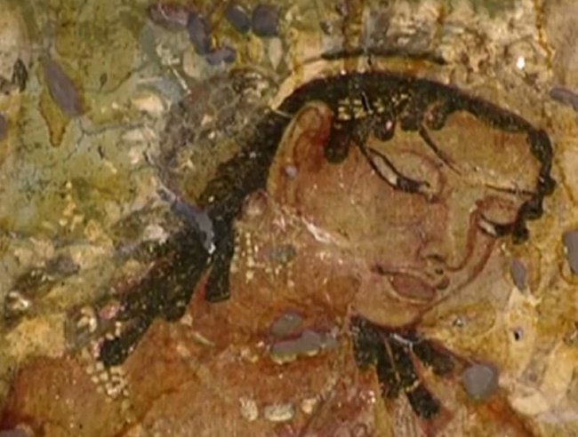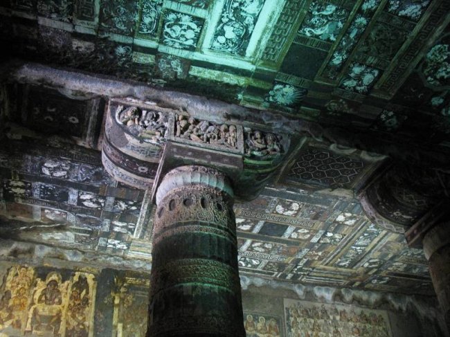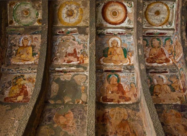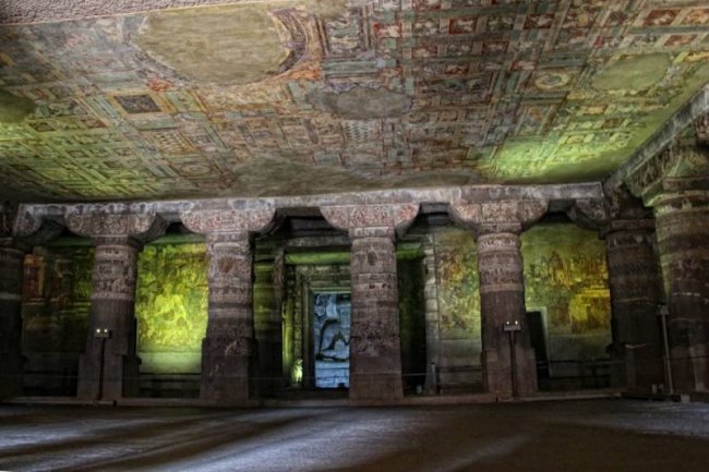 Если вытянуть в линию одни только каменные кружева резьбы, ее длина достигнет снегов Джомолунгмы. А фрески считаются венцом восточного искусства. В одном из подземных залов живопись занимает более тысячи квадратных метров, причем расписаны не только стены, но и колонны, и потолки. Так раньше выглядели все 29 пещер! Индийские мастера как будто стремились перенести в тесный мир подземелий все богатство и разнообразие внешнего мира.