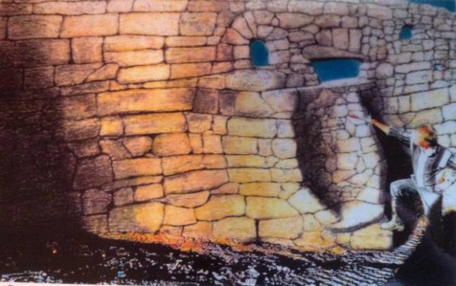 Многие из пустот в стене имеют квадратную форму и напоминают окна или акведуки. На одной из перемычек, выкопанной в 1949 г., есть изображение, которое похоже на древний текст, выбитый в строчку поперёк камня. Ещё загадочнее то, что в 1870 г. в Иллинойсе, во время бурения колодца, на глубине 38 м был найдены предметы, похожие на медные монеты с изображением двух людей. На них присутствуют точно такие письменные знаки, как на этом камне».