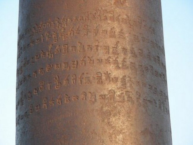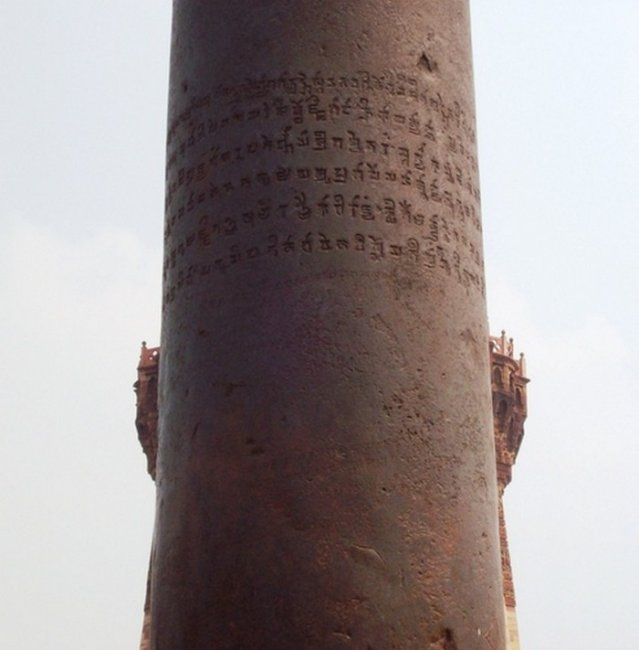 На столбе имеются надписи о том, что этот столб был поставлен сюда в честь победы над народами Азии, еще здесь написано, что колона сделана во время правления Чандрагупты, а это 376-415 года.
