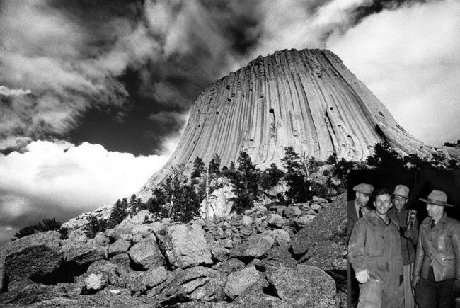 Долгое время дьявольская скала была неприступной. Первый раз на нее взобрался местный житель в конце 19 века. Подвиг был повторен лишь в 1938-ом, скалолазом Джеком Дюрансом. Третьим покорителем дьявольской вершины стал опытный парашютист Джордж Хпокинс, забравшийся на гору сверху в 41 году, выпрыгнув из самолета с парашютом. Приземление прошло удачно, но выбраться оттуда оказалось куда труднее: веревки, которые сбрасывали ему с самолетов, чтобы он мог спуститься, падали мимо или приходили в негодность от удара о камни. Воспользоваться же вертолетом или дирижаблем было нельзя из-за плохих погодных условий. Парашютист на Башне дьявола стал пленником скалы.