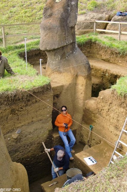Отмечается, что во время раскопок были найдены и механизмы, позволявшие устанавливать колоссов. Ученые установили, что истуканов притаскивали на место установки в горизонтальном положении, а затем устанавливали в выкопанную яму. В качестве направляющих использовались веревки и стволы деревьев.
